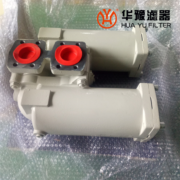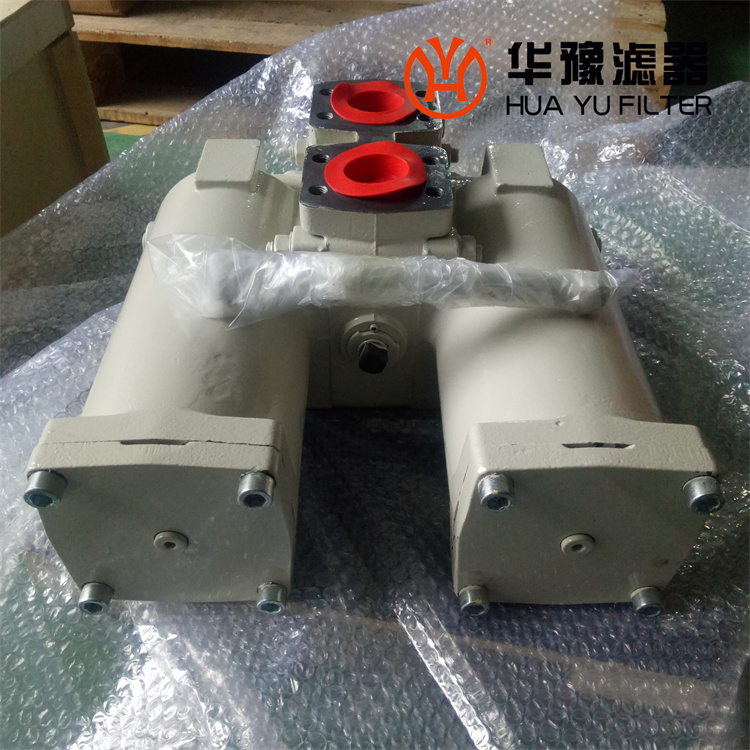 工作時一只濾筒通油,另一只濾筒不通油備用。當(dāng)工作濾筒的濾芯堵塞至壓差發(fā)訊器壓力指示值為0.5MPa時,發(fā)訊器發(fā)訊,此時應(yīng)及時打開壓力平衡閥、轉(zhuǎn)動換向閥啟用備用濾筒(換向閥轉(zhuǎn)動到位后關(guān)閉壓力平衡閥)。再只需旋開螺塞放完被堵塞濾筒內(nèi)的油液,再旋下筒體,就可更換已堵塞的濾芯。如因故未能及時切換換向閥啟用備用濾筒,導(dǎo)致壓差持續(xù)上升至旁通閥開啟壓力0.6MPa時,旁通閥會自動開啟,以避免由于壓力繼續(xù)上升,濾芯破裂造成再污染。但此時油液未經(jīng)過濾對系統(tǒng)安全造成極大危害,應(yīng)盡可能避免旁通閥被開啟。